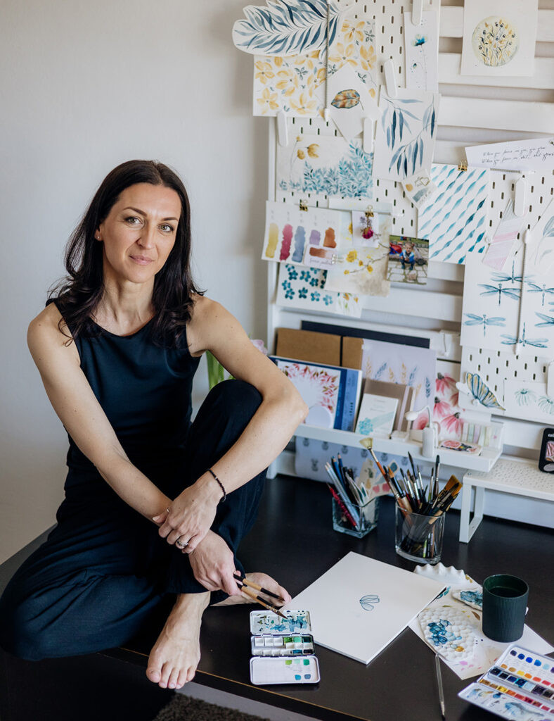 A tak pro vás vytvářím ilustrace a navrhuji povrchové vzory. Takové vzory, které jsou malými světy – plnými listí, květů, ryb a ticha pod hladinou. Příroda v detailech, která zklidňuje a zpřítomňuje.