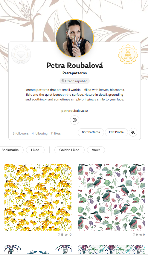 i na platformě Patterned.com, prostoru, který sdružuje tvůrce z celého světa, kteří své motivy vytvářejí ručně, bez umělé inteligence.